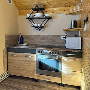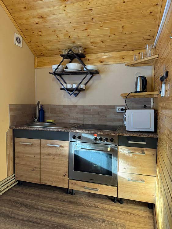 In the cottage there is a kitchenette (microwave oven, fridge, electric kettle, electric stove, kitchen utensils, sink, dining table), TV in the dining area;