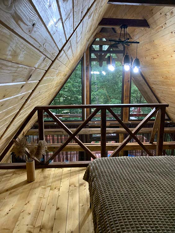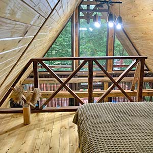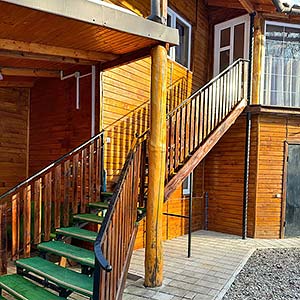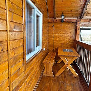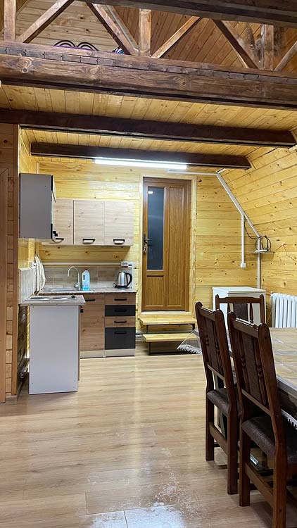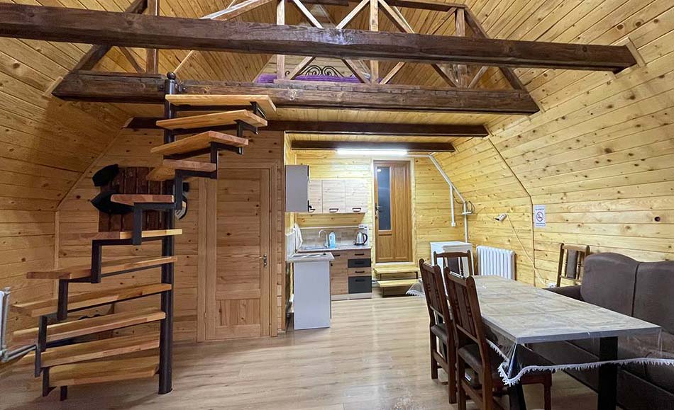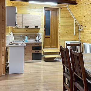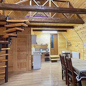 Two-tier cottage for 6-8 persons On the ground tier there is a kitchen with a sitting room (electric cooker, microwave oven, electric kettle, kitchen utensils, sink, dining table, sofa bed, TV set);