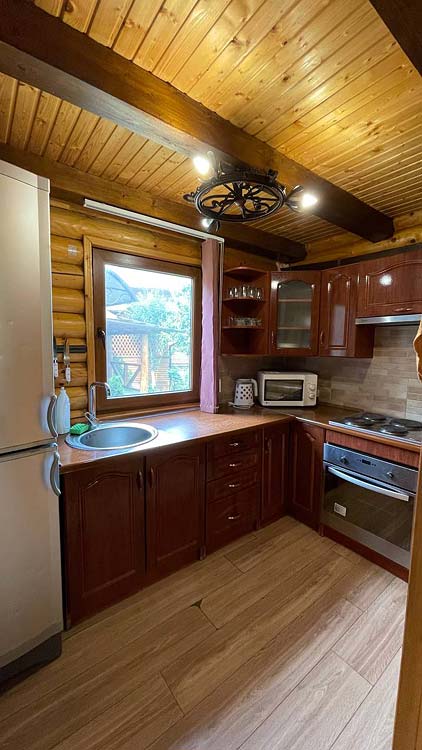 On the first floor from the separate entrance there is a kitchen (microwave oven, fridge, electric kettle, kitchen utensils, sink, table with chairs);