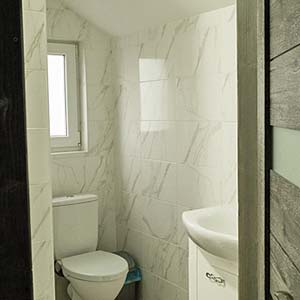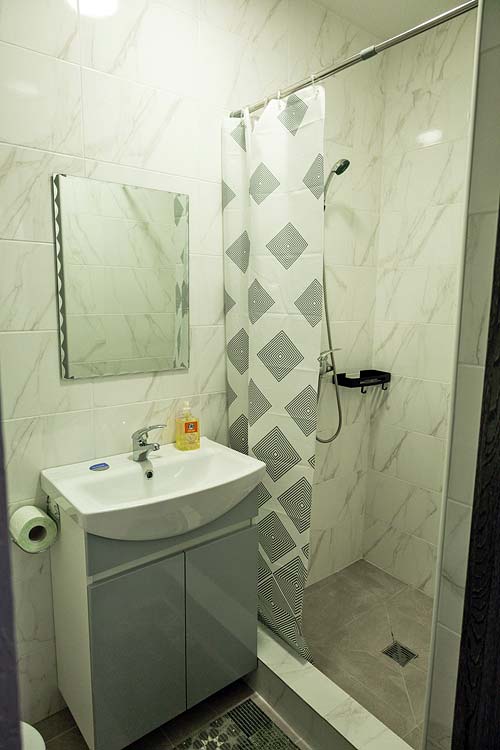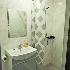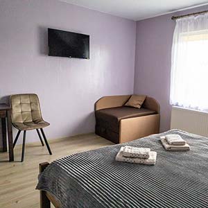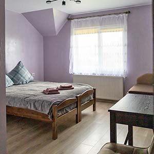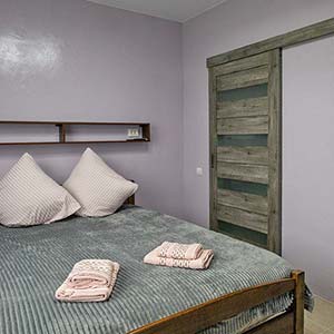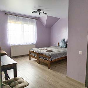 Сімейний — 2 односпальні ліжка, які зсуваються, розкладне ліжко, полиці для одягу, телевізор; санвузол (душ, туалет, умивальник, фен).