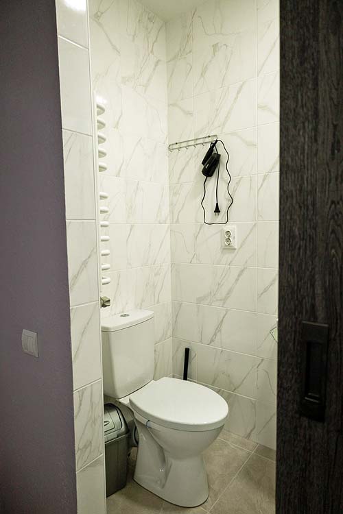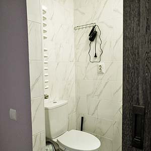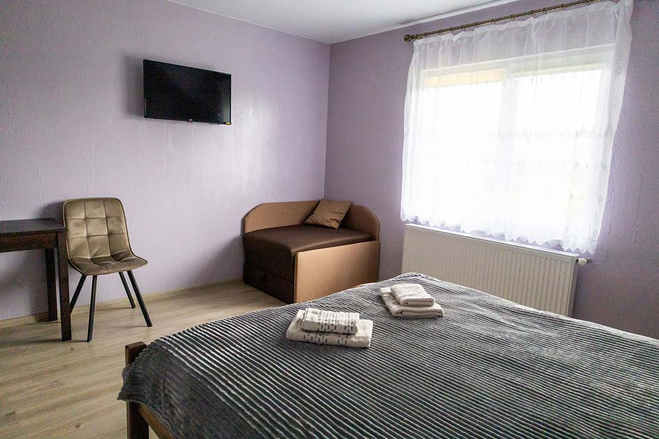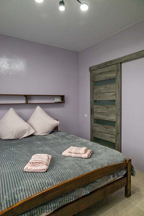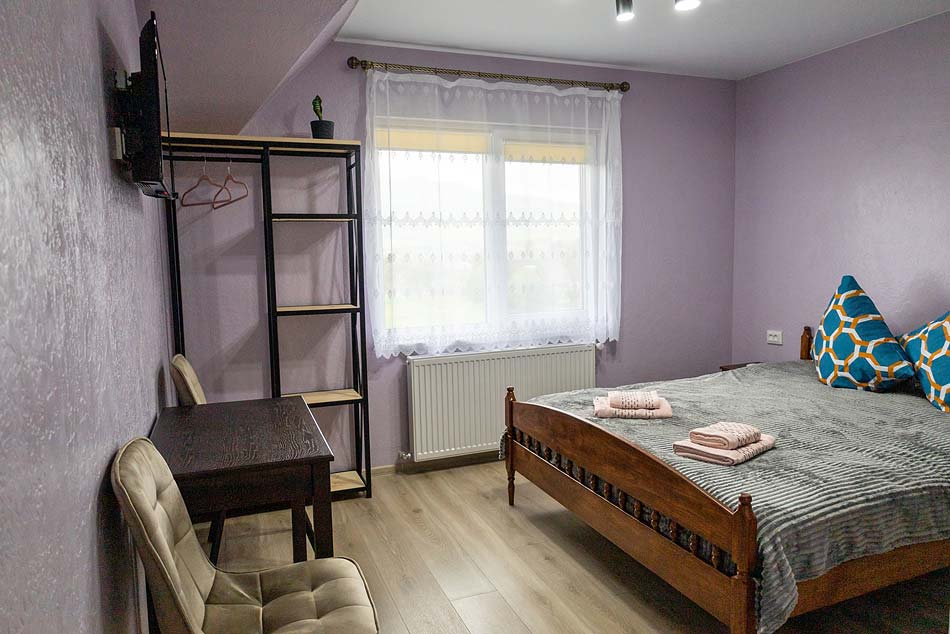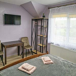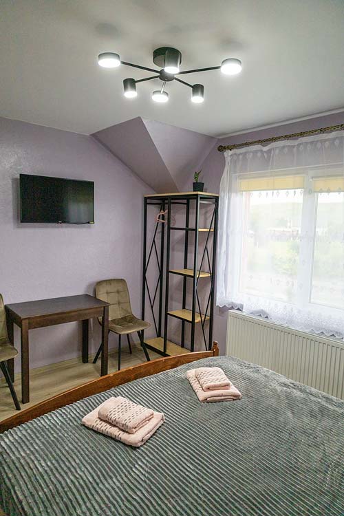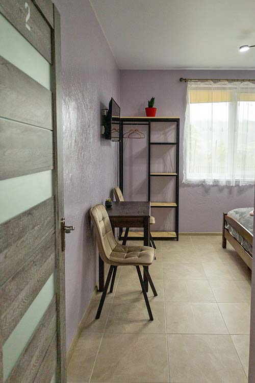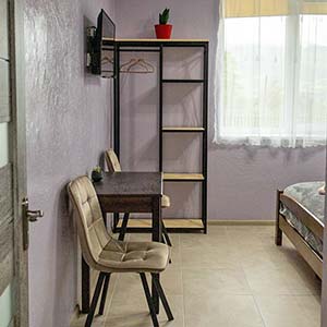 Двомісний — двоспальне ліжко, полиці для одягу, стіл зі стільцями, телевізор; санвузол (душ, туалет, умивальник, фен).